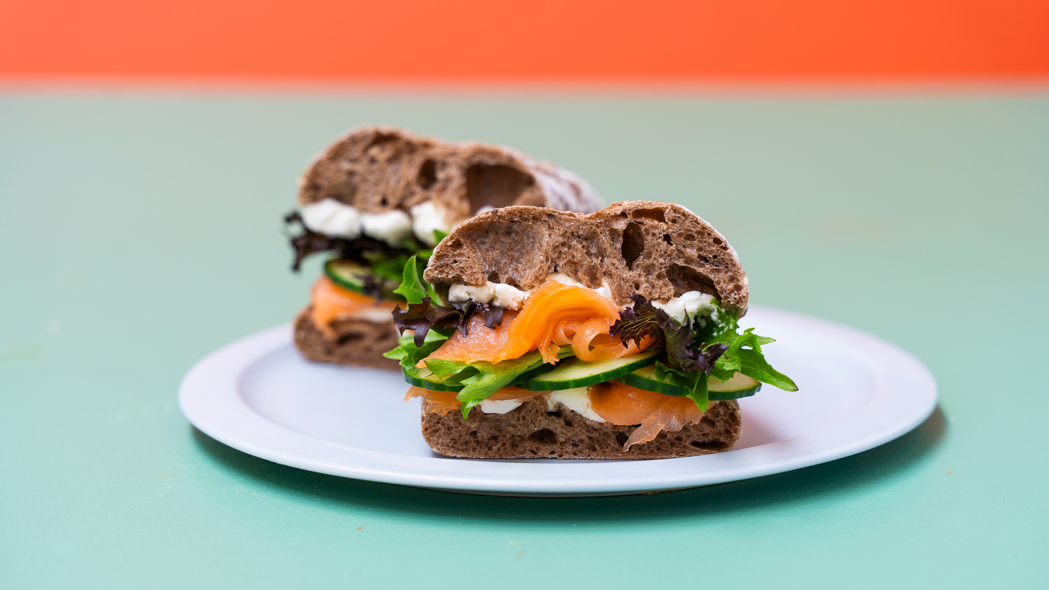 - Sandwich med koldrøget laks med flødeostcreme, agurker og frisk salat