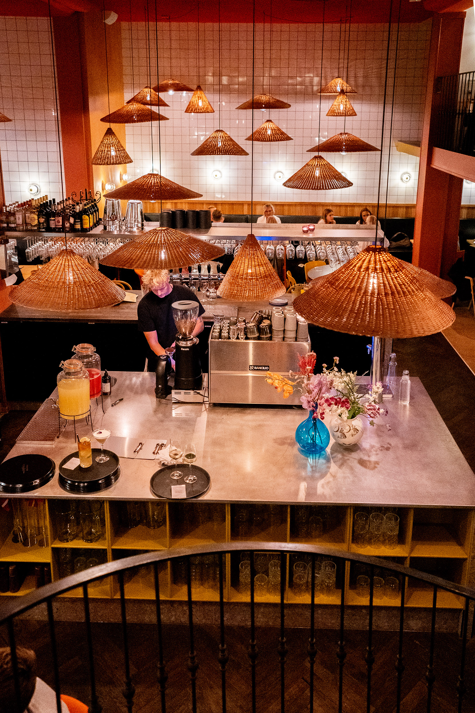 En restaurant med højt(!) til loftet og plads til over 100 mennesker.